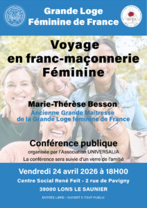 Vous êtes invité.e.s à une conférence publique, donnée par Marie-Thérèse BESSON , ancienne Grande Maîtresse de la Grande Loge féminine de France ,sur le thème Voyage en franc-maçonnerie féminine,